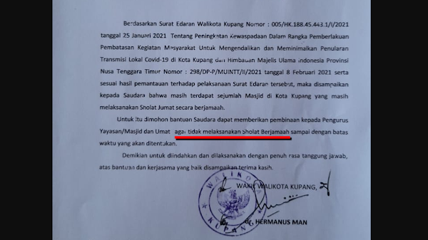 "Berdasarkan Surat Edaran Walikota Kupang Nomor: 005/HK.188.45.443.1/1/2021 tertanggal 25 Januari 2021 tentang peningkatan kewaspadaan dalam rangka pemberlakuan pembatasan kegiatan masyarakat untuk mengendalikan dan meminimalkan penularan transmisi lokal Covid-19 di Kota Kupang dan Himbauan Majelis Ulama Indonesia Provinsi Nusa Tenggara Timur Nomor: 298/DP-P/MUINTT/II/2021 tertanggal 8 Februari 2021 serta sesuai hasil pemantauan terhadap pelaksanaan Surat Edaran tersebut, maka disampaikan kepada Saudara bahwa masih terdapat sejumlah Masjid di Kota Kupang yang masih melaksanakan Sholat Jumat secara berjamaah. Untuk itu dimohon bantuan Saudara dapat memberikan pembinaan kepada Pengurus Yayasan/Masjid dan Umat agar tidak melaksanakan Solat Berjamaah sampai batas waktu yang akan ditentukan. Demikian untuk diindahkan dan dilaksanakan dengan penuh rasa tanggngjawab atas bantuan dan kerjasama yang baik disampaikan terima kasih," isi surat edaran walikota Kupang.